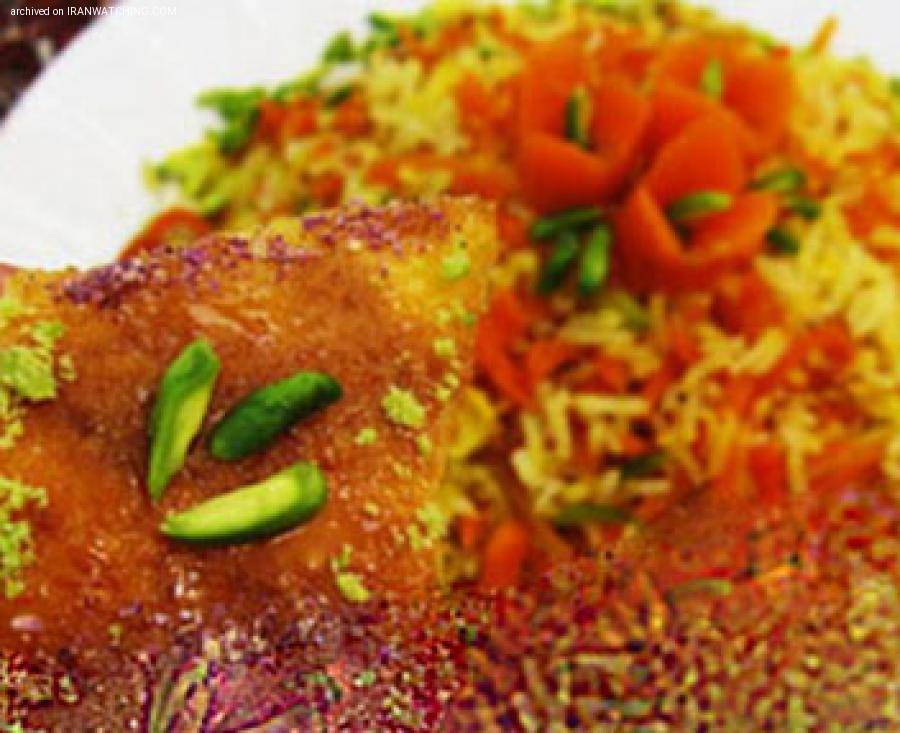 Shirin polo (literally sweet rice) is a desirable food that is cooked and served variously all over Iran; but originally it comes from Qazvin, north of Iran, and is considered as a delicacy. As a result, the dish is served mostly on special occasions; especially at weddings. It is a sweet rice pilaf, sometimes very sweet; nevertheless locals serve this sweet rice with "Kuku Shirin". more sweetness!