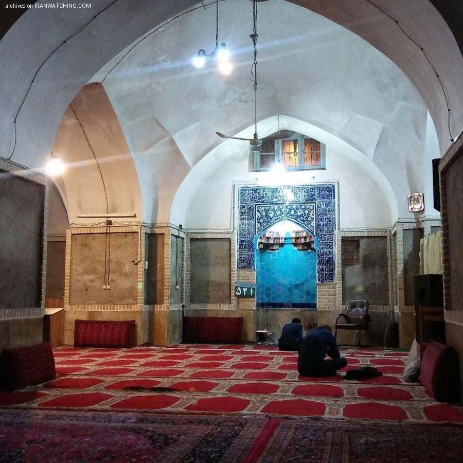 The mosque has two doors, one in Peyghambariyeh St and another in Panje Ali Alley which was settled in 1880. It has a 200 m roofed area with brick arches and the middle columns, walls, and baseboard are built of marble stone and right above the baseboard you can see subtle, blue tile work. The mosque’s mihrab is also built of marble stone with round blue tiling on which is written the names of Shia Imams in Naskh (one of the first scripts of Islamic calligraphy), with white color and is adorned with Muqarnas (three-dimensional decoration of Islamic architecture) and plasterwork.