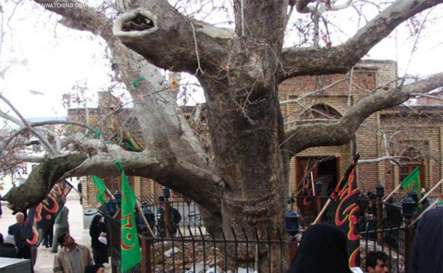 According to remained inscriptions from the Safavid dynasty, this phenomenon dates back to king Sultan Husayn's reign. It has a 30-meter height and 10-meter diameter. Dou to a special feature of this tree, it’s been in great attention especially by Muharram grievers (Muslims grief over Imam Hossein’s death). Every year on the same day (Ashura, the tenth day of Muharram,) a reddish juice (sap) leaks out of the tree and the interesting point is that the Hijri date changes don’t affect this marvelous feature of this plane tree. Especially when Muharram is in winter and the phenomenon still occurs which is a mystery to everyone because the nature of the tree requires warm weather to flow sap out. Some witnesses also claim that the moment its juice leaks out you can feel the scent of heavenly flowers all over you.