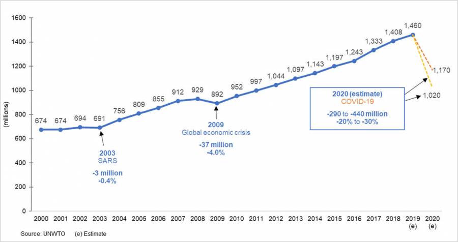 طبق آخرین گزارشهای سازمان جهانی گردشگری (UNWTO) و شورای جهانی سفر (WTTC)، در سالی که قرار بود رونق مشاغل و کارآفرینی در صنعت گردشگری و هتلداری جهان رخ دهد، با ظهور ویروس کرونا، 50 میلیون شغل در صنعت گردشگری و مهمان نوازی در معرض نابودی قرار گرفته، حجم درآمدهای حاصل از این صنعت به یک سوم نزول کرده که حجم تخمینی این رکود، عددی حدود 300 تا 450 میلیارد دلار است. همچنین پیش بینیها نشان میدهد 290 تا 440 میلیون گردشگر ورودی بینالمللی به کشورهای مختلف جهان سفر نخواهند کرد و با شیب 20 تا 30 درصدی نزول گردشگری در یکماه گذشته، نسبت رکود تعداد مسافران بینالمللی که سفر نرفتند و نخواهند رفت، به اندازهی حجم 5 تا 7 سال رشد گردشگرها در سالهای گذشته بوده و این روند نزولی ادامه خواهد داشت.