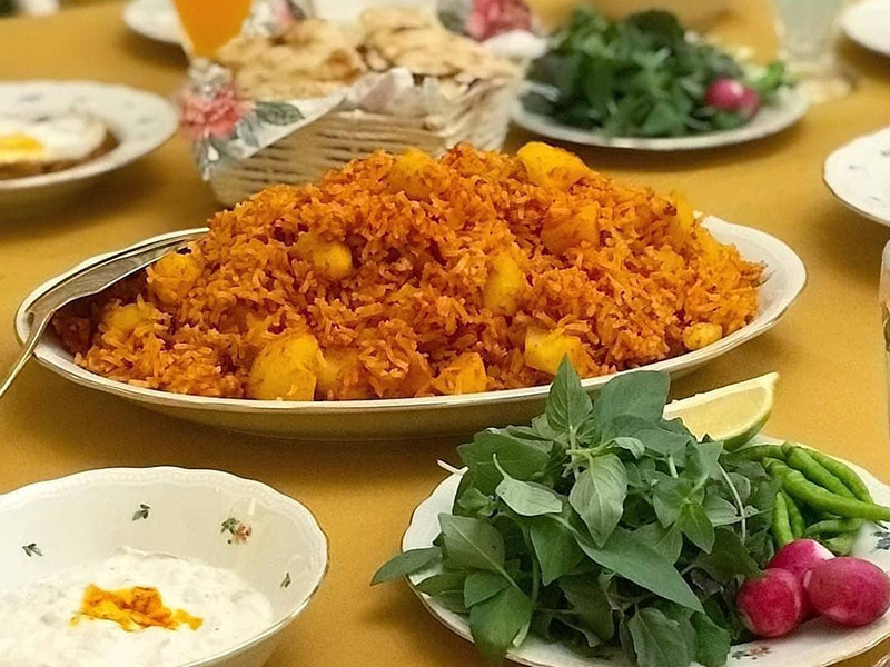 نکته: میتوانید سیبزمینی و مواد گوشتی را جداگانه سرخ کرده و به صورت لایهلایه به برنج آبکش شده اضافه کنید.