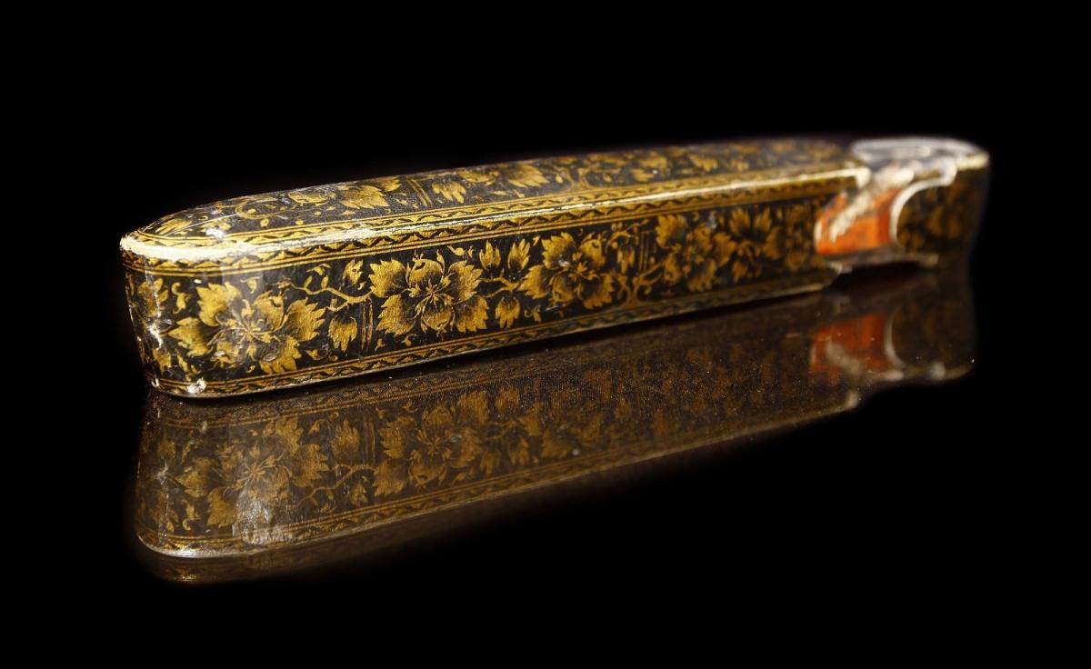 با توجه به اینکه این اشیا برای چه قشری ساخته میشد، تزئینات روی آن را پرکار و با هزینهی بیشتر و یا کمکار و معمولیتر میساختند. برای مثال اگر قلمدانی به عنوان شیای تجملی و تزیینی ساخته میشد در آن از آب طلا برای تزئین و ایجاد نقوش استفاده میکردند، ولی اگر به عنوان شیای کاربردی بود با مواد طبیعی و رنگی ارزانتر تزئینات آن را انجام میدادند.