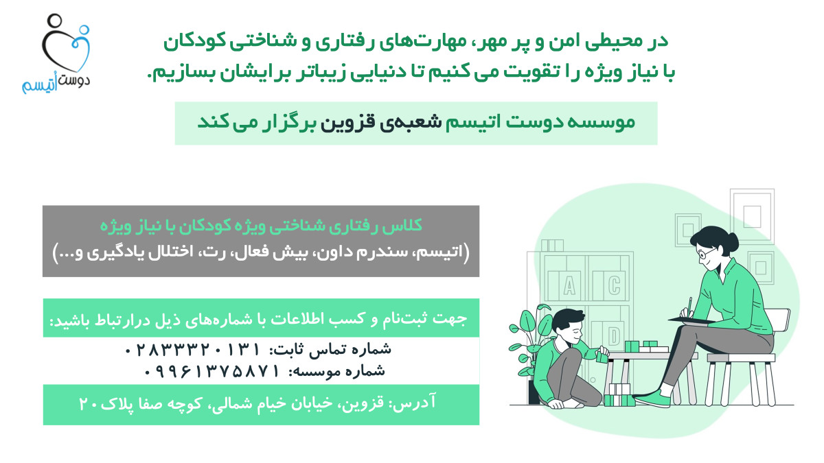 کلمات کلیدی: اتیسم در قزوین، مرکز اتیسم در قزوین، مربی اتیسم در قزوین، کلاس رفتاری شناختی در قزوین،