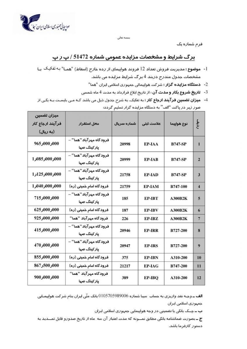 مزایده برای فروش ۱۲ فروند هواپیمای ایران ایر - هواپیماهای مستهلک هما به چه کار می آیند؟ مزایده برای فروش ۱۲ فروند هواپیمای ایران ایر - هواپیماهای مستهلک هما به چه کار می آیند؟