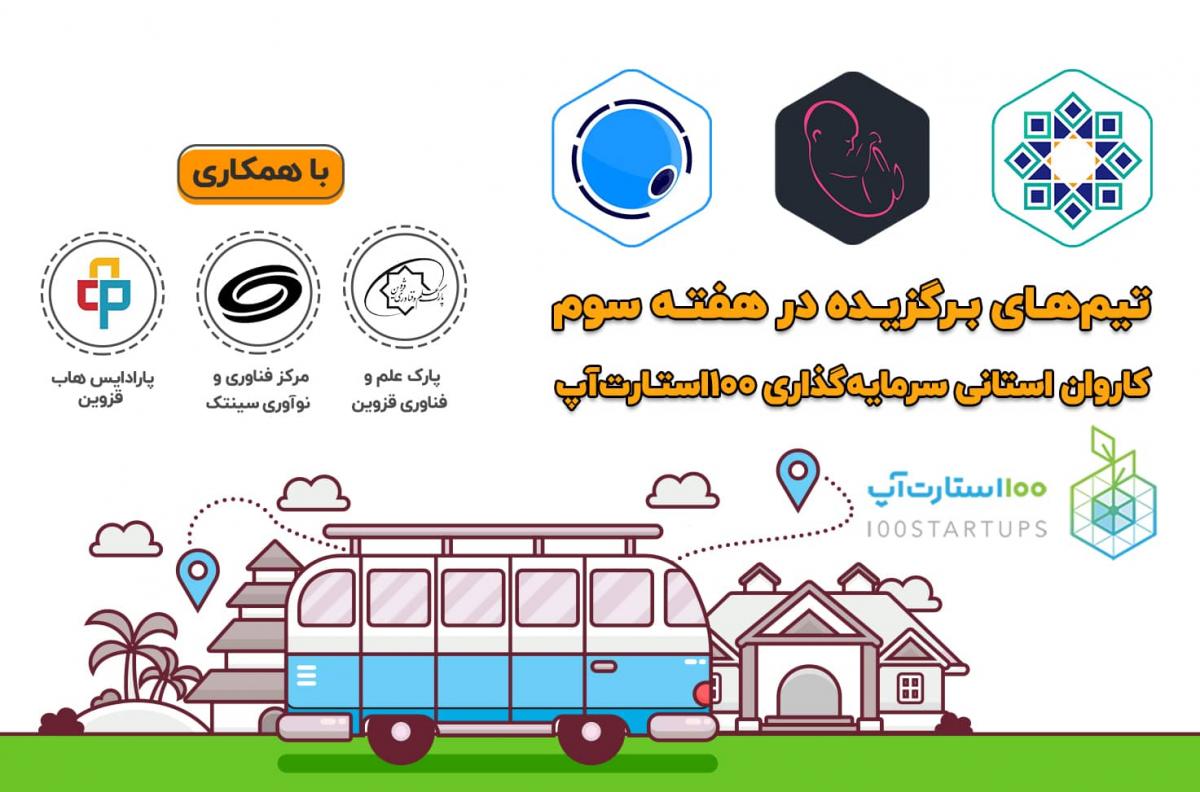 کاروان سرمایهگذاری 100 استارتاپ در حالی به کار خود در قزوین پایان داد که از مجموع 43 طرح ارسال شده، 3 طرح از نگاه داوران برگزیده و در دستور بررسی موشکافانه سرمایه گذاران قرار گرفتند. در این رویداد یک روزه مجازی، از بین 43 طرح ارسال شده از استان قزوین، 6 طرح به داوری راه یافتند و نهایتا 3 تیم از نگاه داوران برای سرمایهگذاری برگزیده شدند. تیمهای حاضر در این رویداد عبارت بودند از: آیکپچا (نرم افزارتولید کد کپچا)، ایلیثیا (گجت پایش سلامت جنین)، اوربی (ساخت رباتهای اسباب بازی)، ایرسا صنعت شهر (ربات آتش نشان)، برتل (بازی مناسب کودکان اوتیسم) و ایراننگری (دانشنامه تخصصی میراث فرهنگی ناملموس).