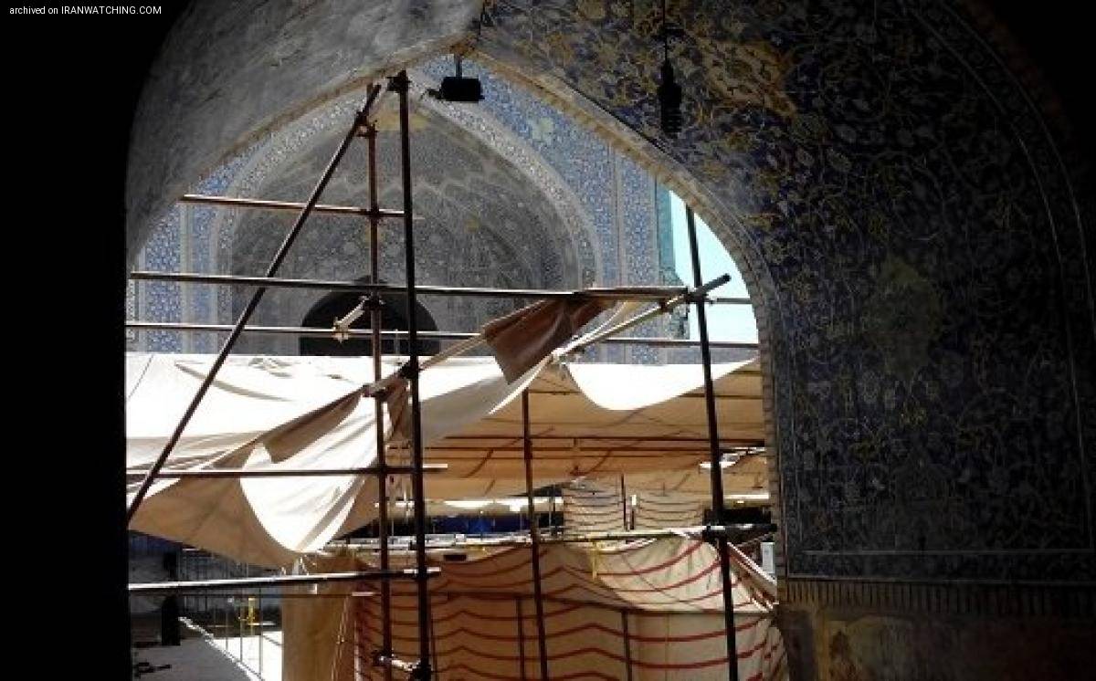 در جدیدترین نوعِ رفتارها، کارگرِ در حالِ کار، میلههای داربستی را که در حال نصب در فضای داخلی مسجد امام (ره) است را از بالا به پایین و برعکس به بدنهی کاشیکاری شده مسجد امام اصفهان میکشد تا همکارش میله را گرفته و سرجای خود نصب کند. کارگر دیگر خودش را از بالای بوم، بین جدارهها گیر میدهد تا کار نصب داربستها را تمام کند، اما گیرندهی فیلم وقتی به او برای این کار اعتراض میکند، میگوید: این کار عادی است برای نصب داربستها!