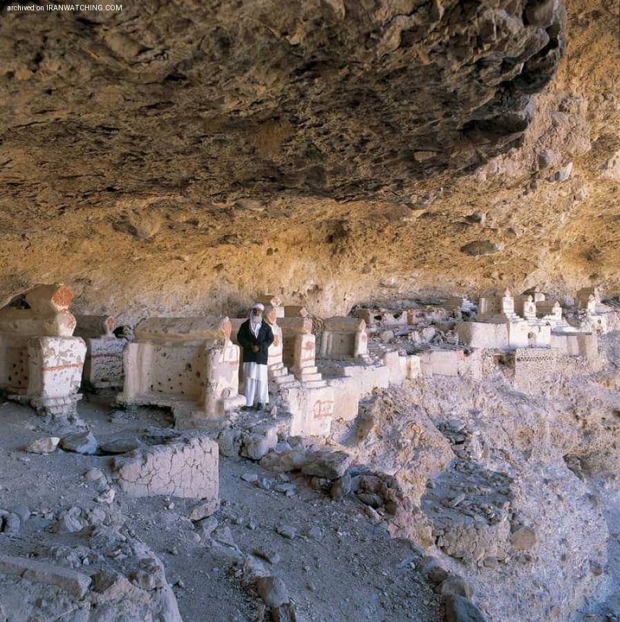 این گورستان در دل غاری قرار گرفته و به همین دلیل از گزند باد و بارش و حتی نور خورشید در امان مانده است. این قبرستان همیشه در سایه است. مساحت آن در حدود 500 متر مربع است و جوری در دل سنگها کنده شده است که هر بینندهای را شگفتزده میکند. اجساد در میان قبرهایی که با خشت ساخته شدهاند و از سطح زمین بالاتر است قرار گرفتهاند و در دیوارههای هر قبر نیز سوراخهایی وجود دارد که هوا از میان آن عبور میکند. بر روی دیوارها و برخی از قبور نیز با خاکی سرخرنگ تزییناتی کشیده شده است.