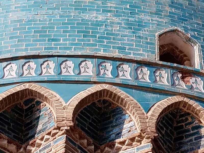 مصالح به کار رفته در بنا شامل سنگ، آجر، گچ، چوب و کاشی میشود و تزیینات آن از گچبری و كاشیكاری در نمای داخلی و خارجی تشکیل شده است. این بنای تاریخی از نوع برجهای ترکدار به حساب میآید که از 33 ترک، گنبد رک و كاشیکاری فیروزهای تشکیل میشود.