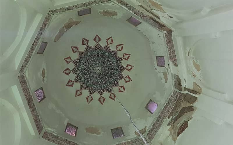 در قسمت مرکزی پوستهی داخلی گنبد، تزیینات گچبری با تکنیک برجسته دیده میشود که شامل یک شمسه و یک گل ششپر است. تمام این تزیینات به رنگهای قرمز و فیروزهای هستند. در خارج شمسه و در امتداد هر یک از شعاعهای آن یک نقش گیاهی برجستهی گچی در درون یک لوزی به چشم میخورد که زمینهی آن با رنگ قرمز رنگآمیزی شده است.