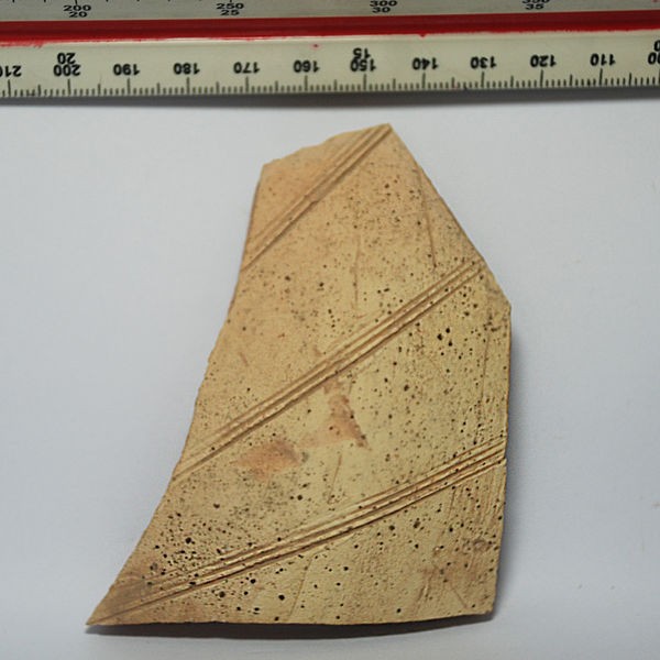 قطعهای از یک ظرف سبو مانند با بدنهی کروی و خمیرهای به رنگ قهوهای روشن نیز یافت شده که شاموت آن را شن متراکم و ذرات آهک تشکیل میدهد. این سفال چرخساز و بدون تزئینات است و در حرارت نامناسب پخته شده است. علاوه بر این قطعه، تکهای از یک ظرف نسبتا خشن با ضخامتی در حدود یک سانتیمتر به دست آمده که خمیرهی آن به رنگ نخودی متمایل به نارنجی با شاموت فراوان ماسه است.