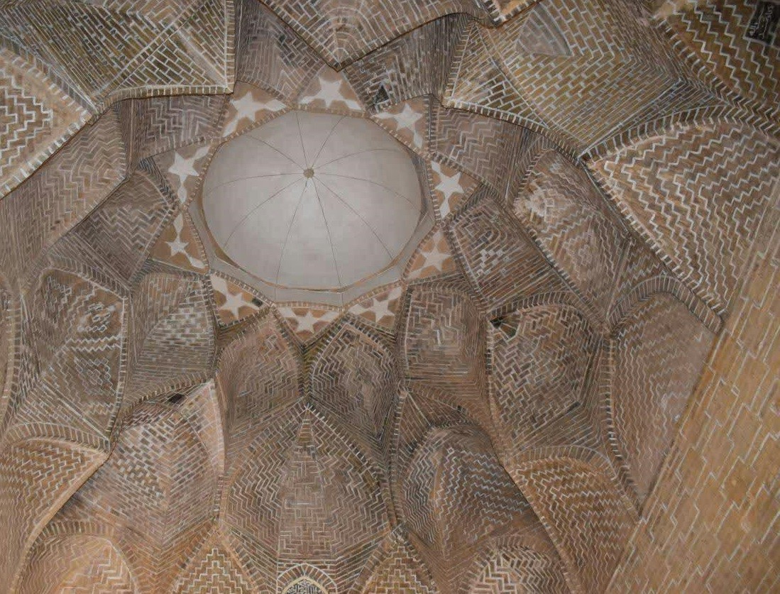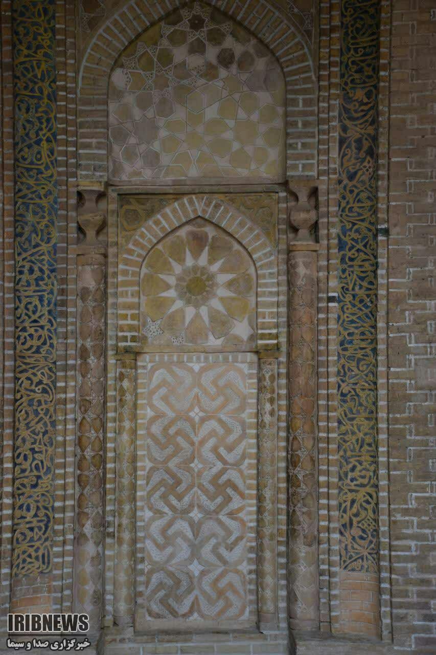 خطوط گچبری اطراف محراب دارای زمینهی آبی و بعد از بسمالله الرحمن الرحیم، آیهی آیت الکرسی نوشته شده است. گنبدخانهی این مسجد به شکل مربعی است و با گنبدی پوشیده شده که بر روی فیلپوشها استوار است. شبستان آن نیز میان گنبدخانه و ایوان اصلی قرار دارد و از طریق راهرویی به فضای شبستان کوچک شرقی دسترسی پیدا میکند. در ضلع شمالی صحن مسجد، سردر و ایوانی بزرگ به چشم میخورد که با کوچهی مجاور مسجد ارتباط دارد. در گوشهی شمال غربی، منارهای به ارتفاع 30 متر که از وسط کج شده قرار دارد. تمام سطح آن نیز با نقوش آجرکاری به شیوهی هـشتوگیر و قسمت فوقانی آن با کتیبهی کاشی فیروزهای تزئین شده است. در پایین مناره، کتیبهای به خط کوفی بر روی آجری برجسته در چهار سطر، نام سازنده و سال ساخت مناره را سال 526 هجری قمری ذکر کرده است و در بالای آن نیز کتیبهی کاشی فیروزهای به خط کوفی مزین به آیهی 33 سورهی فصلت وجود دارد. در طاق تویزه میان گنبدخانه و بخش جلویی آن، تزئینات آجری و توپیهای گچی با نقوش گرهچینی مشاهده میشود.