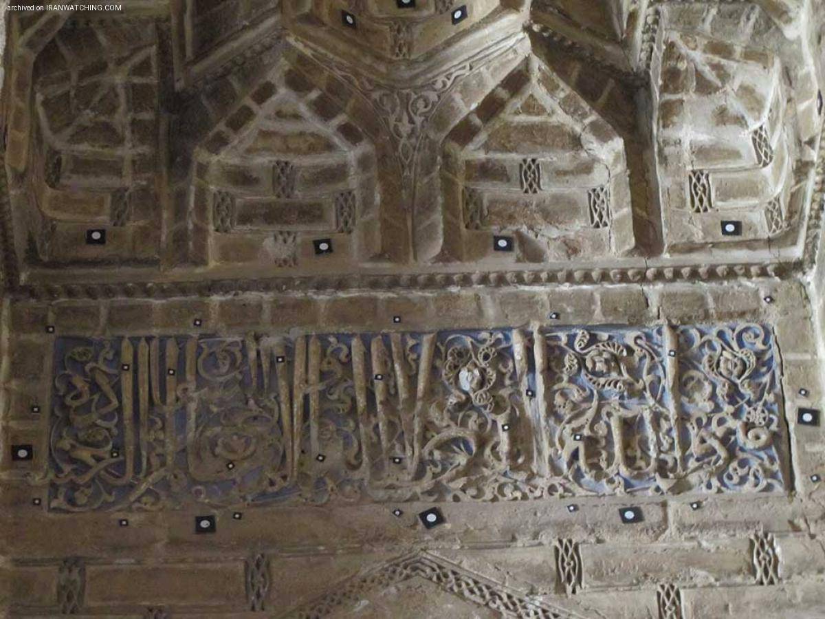 در قسمت بالای گنبدخانه پیرامون طاقنماها و هلالهای آنها کتیبهای نادر به خط ثلث برجسته نگاشته شدهاست که حمد و ثنای خدای متعال میگوید.